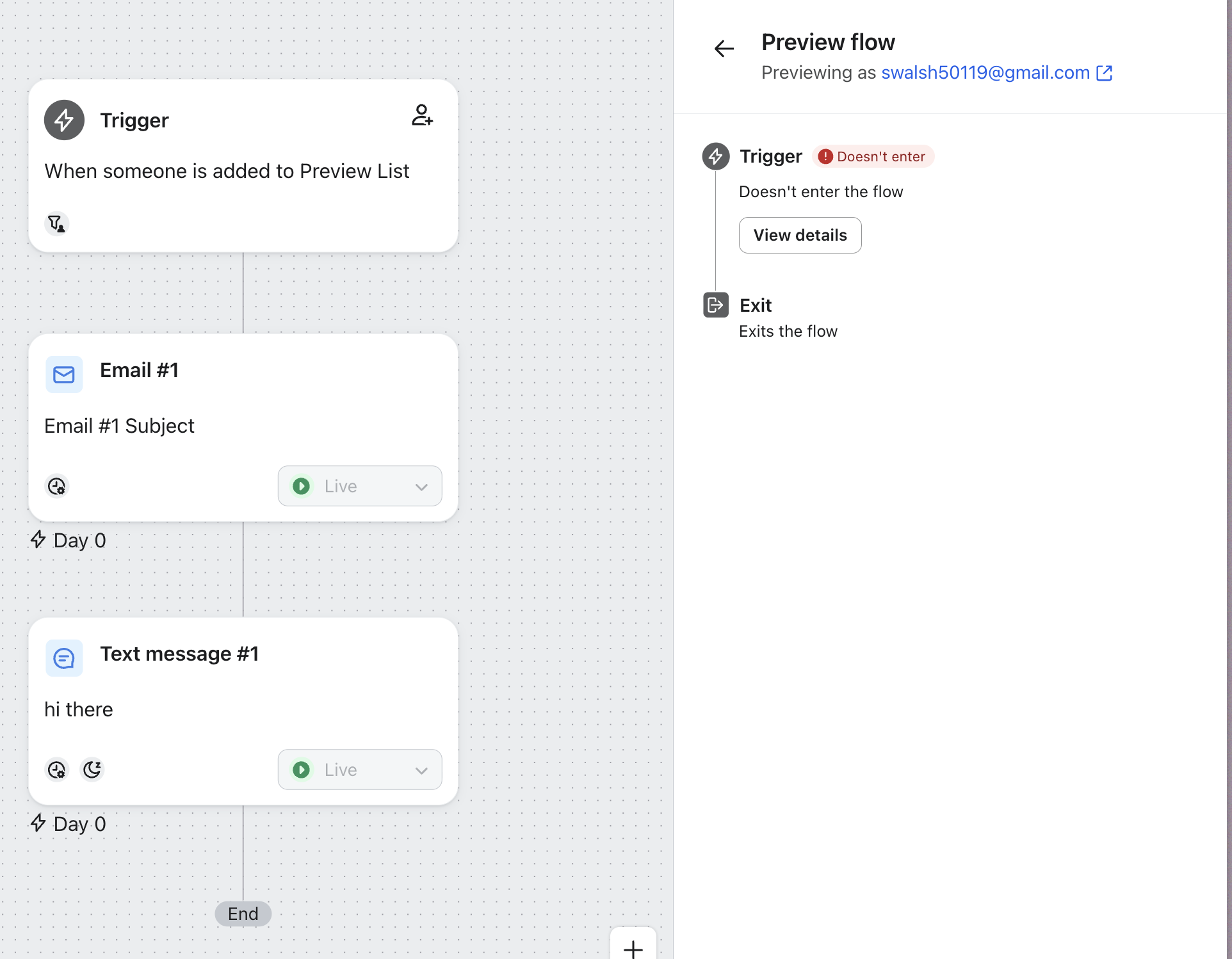 - De preview controleert de abonnementsstatus niet. Als de status van een profiel is afgemeld, laat de preview nog steeds zien hoe ze zich door de flow bewegen alsof ze zich opnieuw hebben aangemeld.