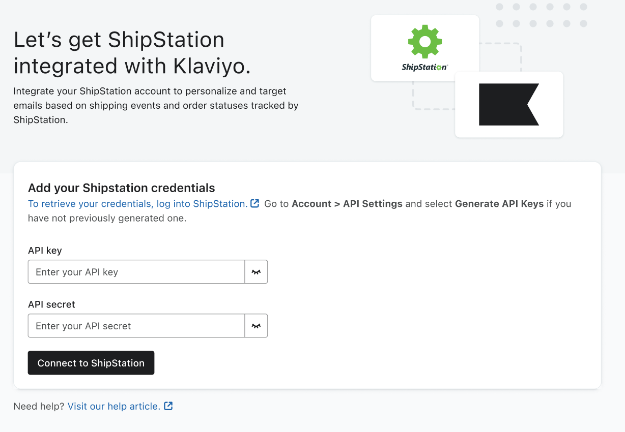 Om te integreren met Klaviyo heb je een API-sleutel en een geheim van ShipStation nodig. Je moet ShipStation's V1 API gebruiken om te integreren. API-sleutel en API-geheim worden alleen getoond in ShipStation's UI wanneer ze worden gegenereerd en alleen aan de gebruiker die ze heeft gegenereerd.