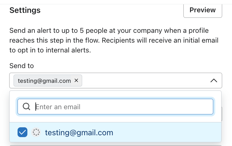 Leer hoe je je aan- en afmeldt voor de interne waarschuwingsactie in een Klaviyo flow. Iemand hoeft geen profiel te hebben in je Klaviyo account, of te bestaan als account gebruiker, om e-mail te ontvangen van een interne waarschuwingsactie. Alle ontvangers moeten er echter voor kiezen om interne waarschuwingen van je account te ontvangen voordat ze berichten gaan ontvangen. Ze kunnen zich ook op elk moment afmelden. In dit artikel leggen we het ontvangers opt-in en opt-out proces uit voor de interne waarschuwingsactie en de verschillende statussen.