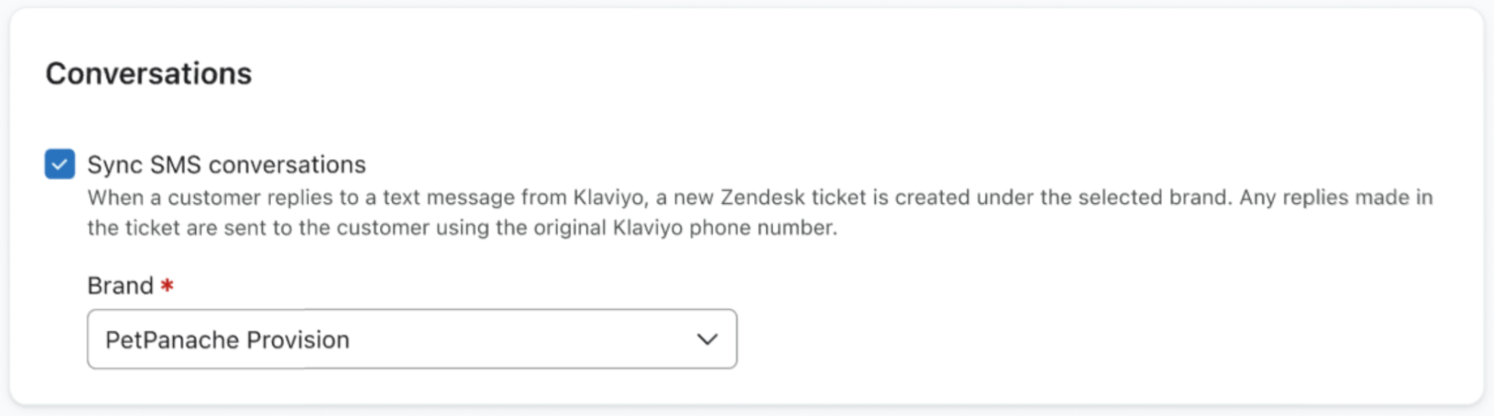 Als je meer dan één merk hebt ingesteld onder een Zendesk Enterprise account, kun je één Zendesk-merk synchroniseren per Klaviyo account zodat je gemakkelijk je ticketgegevens kunt gebruiken en je sms-gesprekken kunt organiseren.
