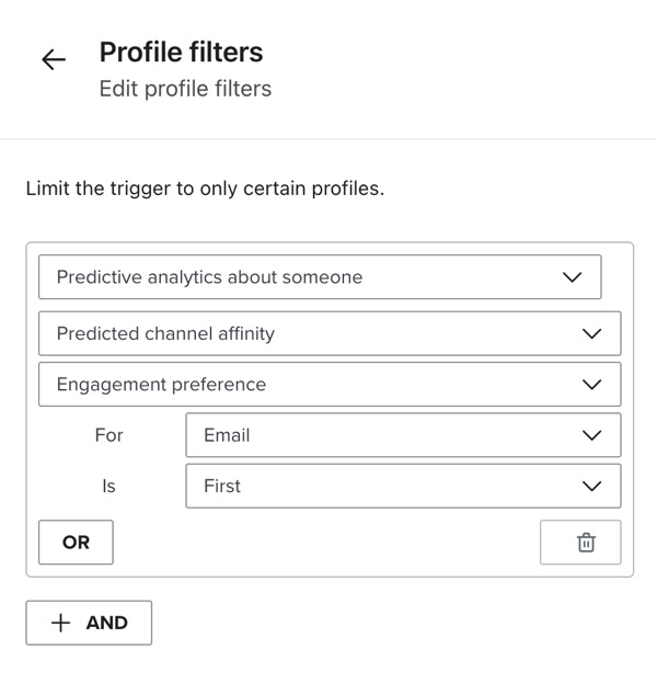 - Selecteer je trigger en klik op de knop Toevoegen of Bewerken naast de optie Profielfilter in de rechter zijbalk.