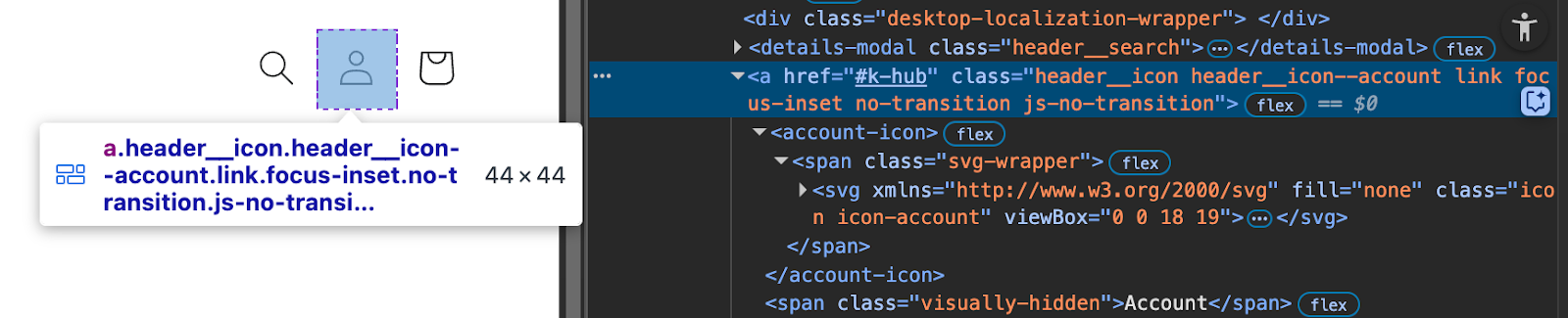 Om Klaviyo's Klaviyo Customer Hub te kunnen openen door op het account icoon in de header van je winkel te klikken, moet je al een bestaande a-tag hebben die verwijst naar een link met /account (in dat geval vervangen wij deze automatisch voor je). Je kunt ook handmatig de pictogramlink definiëren om naar #k-hub te wijzen om de lade te openen.