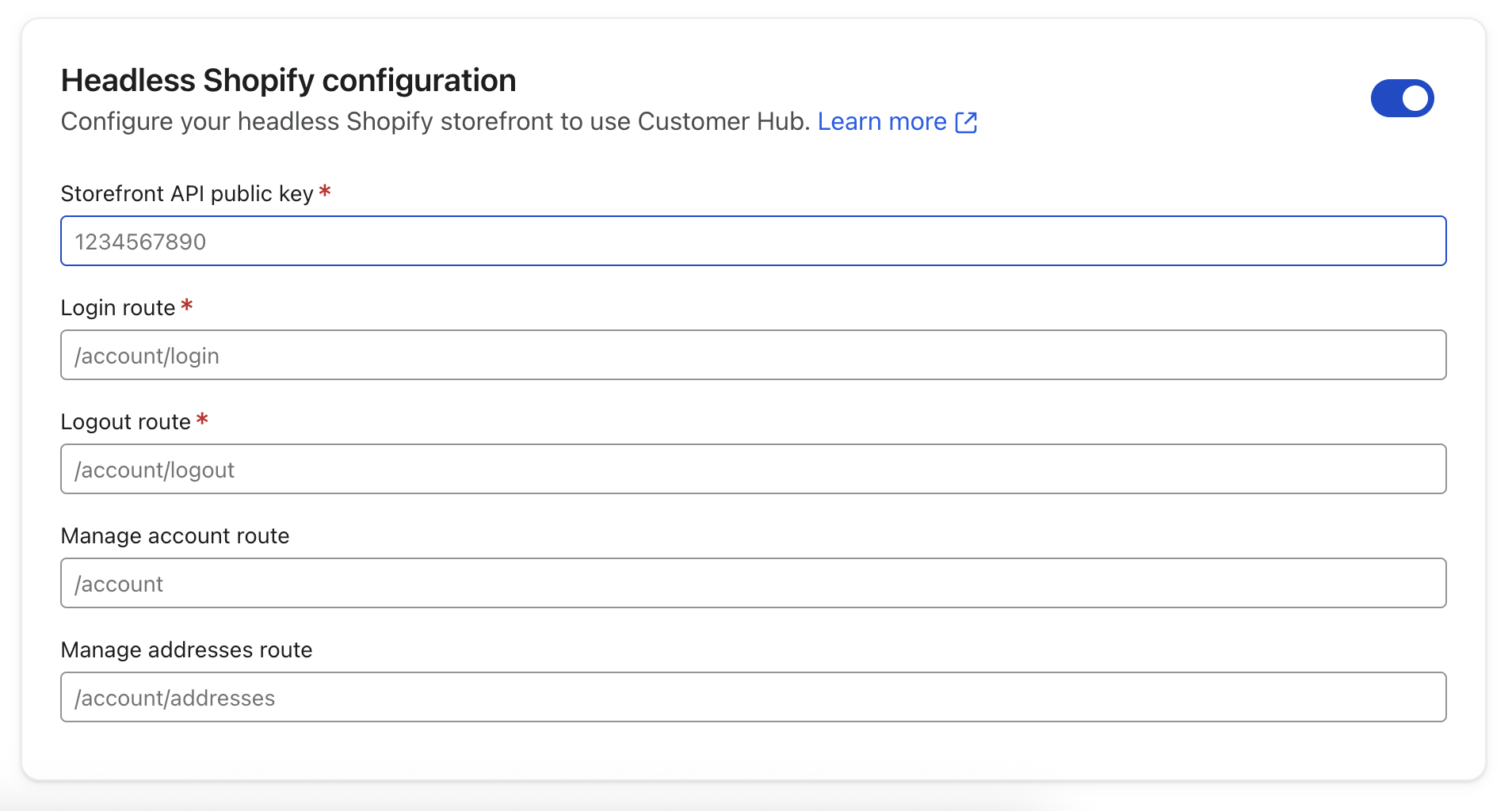 Als je Shopify Klantaccount API selecteert, voer dan ook de Login, Logout en optionele Manage account/Manageaddresses routes in (gebruikt voor omleidingen tussen de Hub en je site).