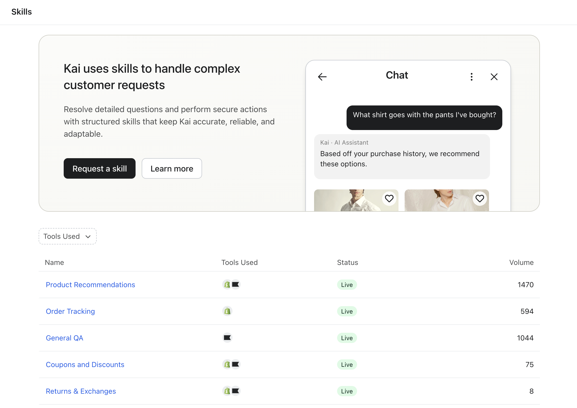 Elke vaardigheid is speciaal ontwikkeld voor een bepaald domein, zoals retouren, bestellingen tracking of loyaliteitsprogramma's. Vaardigheden putten uit de inhoud van je kennisbank, verbonden integraties en klantprofileringgegevens om accurate, merkspecifieke antwoorden te geven. Als een vaardigheid een verzoek niet volledig kan oplossen, voert het een zachte handoff uit naar een menselijke agent, zodat je team verder kan gaan waar de AI was gebleven.