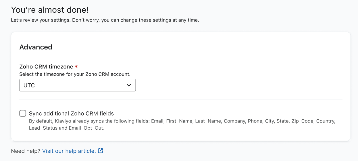 - powrót w Klaviyo, wybierz swoją Zoho CRM strefę czasową z listy rozwijanej. Musi to być ta sama strefa czasowa, co Twoje konto Zoho.
