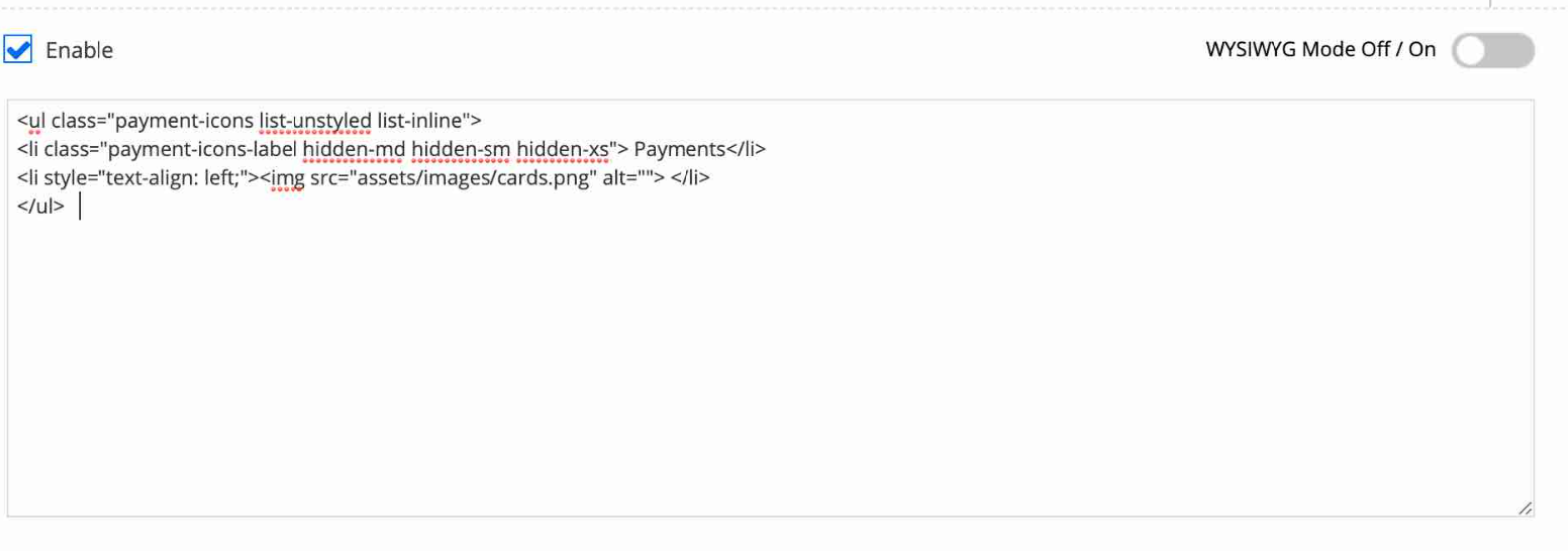 - Kliknij suwak obok opcji Tryb WYSIWYG wyłączony / włączony, aby przełączyć widok do edytora HTML.