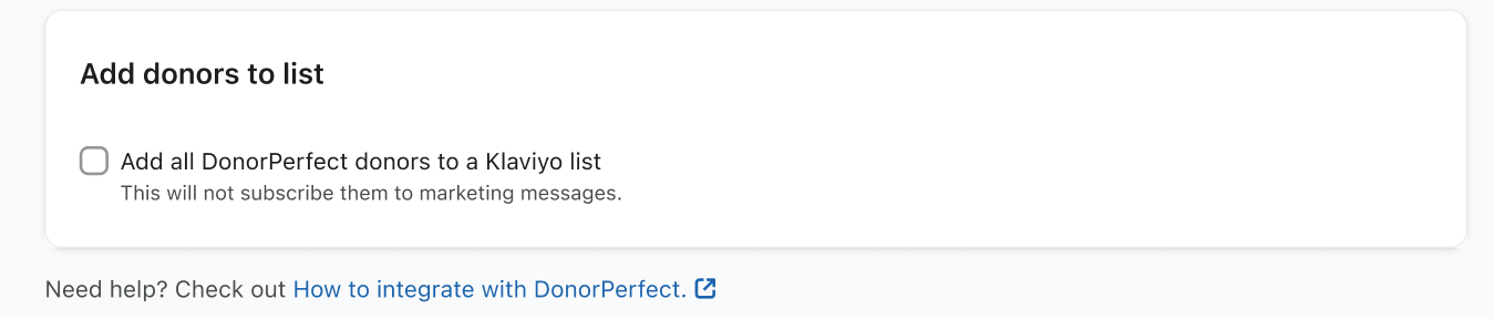 - Na następnej stronie wybierz opcję Dodaj wszystkich darczyńców DonorPerfect do listy Klaviyo , a następnie wybierz listę z rozwijanego menu, które się pojawi.