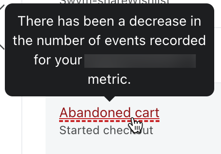 Klaviyo powiadomi Cię, jeśli nastąpi nagły spadek aktywności dla jednej z Twoich metryk e-commerce w porównaniu z historyczną aktywnością dla Twojego konta.