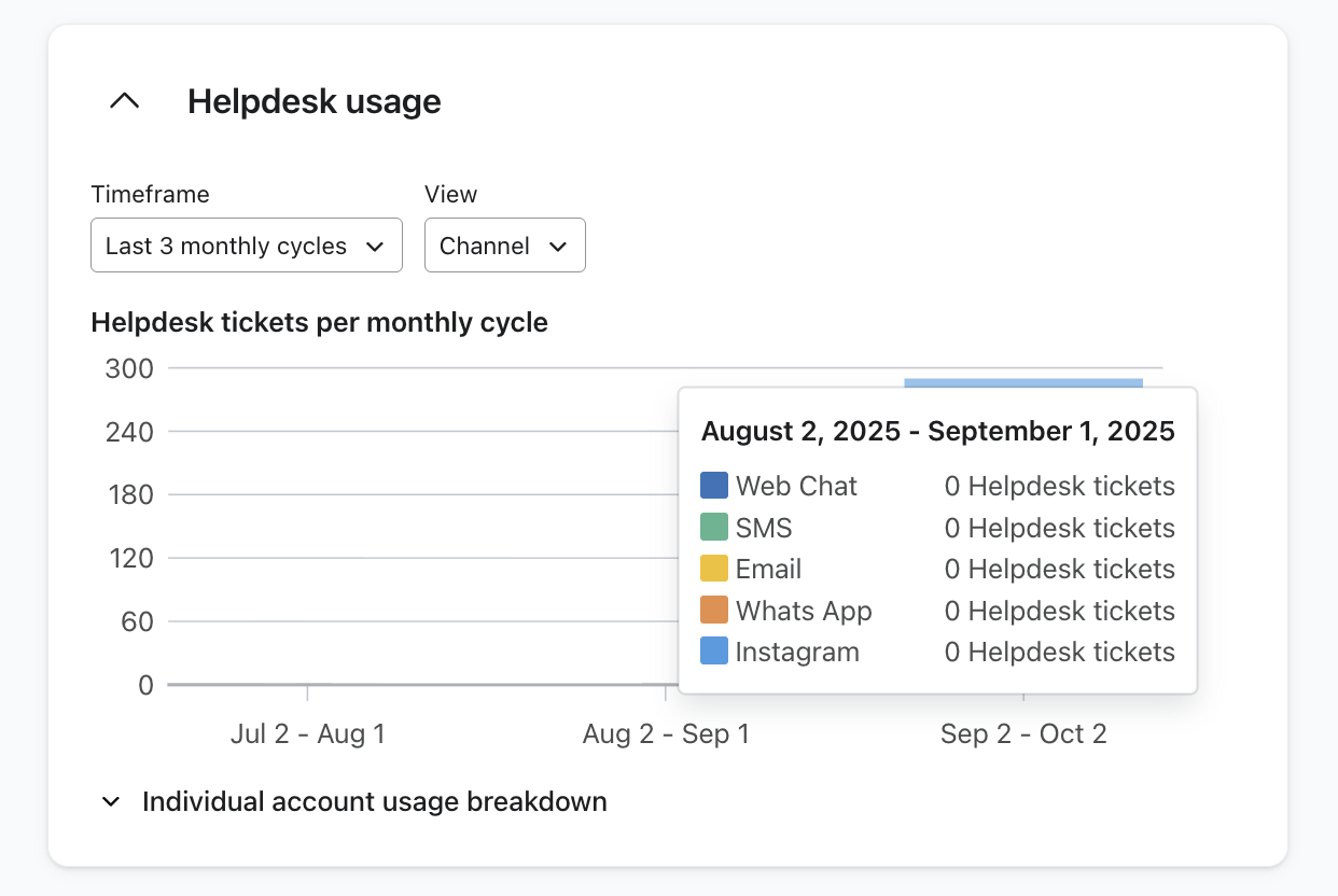 Ten wykres przedstawia liczbę biletów Helpdesk, które zostały otwarte w danym cyklu rozliczeniowym. Możesz sprawdzić łączną liczbę w ciągu ostatnich 3, 6 lub 12 cykli rozliczeniowych.