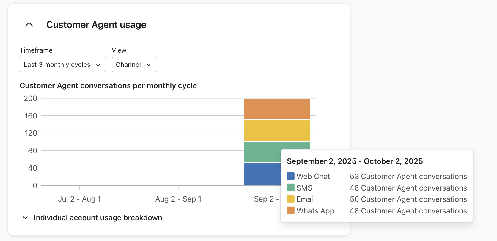 Ten wykres przedstawia liczbę rozmów z agentem klienta, które zostały rozwiązane w danym cyklu rozliczeniowym. Możesz sprawdzić łączną liczbę w ciągu ostatnich 3, 6 lub 12 cykli rozliczeniowych.