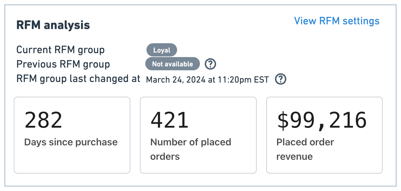 Pamiętaj, że wskaźnik RFM pulpitu aktualizuje się natychmiast, podczas gdy zmiany na rekordzie profilu aktualizują się co 24 godziny. W związku z tym możesz zobaczyć różnice w liczbach na wskaźnik grupy RFM w pulpicie, które nie są jeszcze odzwierciedlone w Twoim profilu.