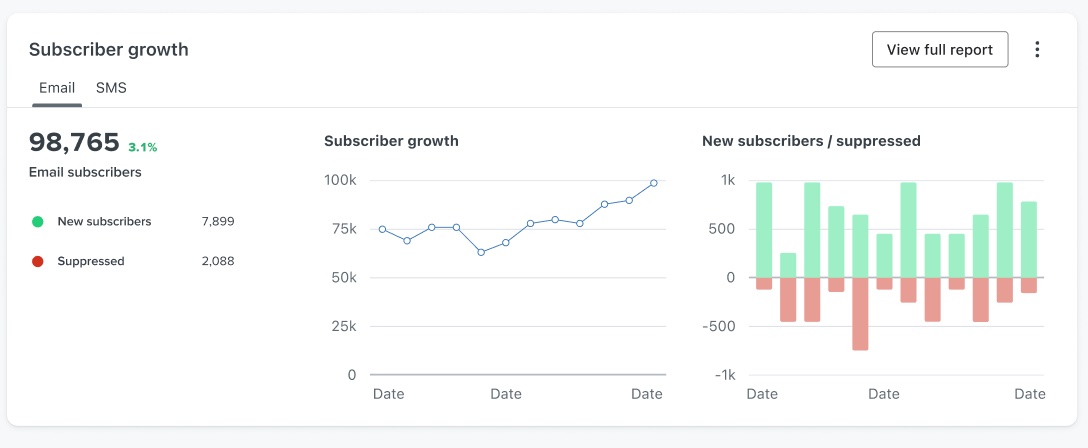 Kartysubskrybentów wiadomości e-mail i subskrybentów wiadomości tekstowych zapewniają podgląd wyników subskrybentów w wybranym zakresie czasowym, w tym: