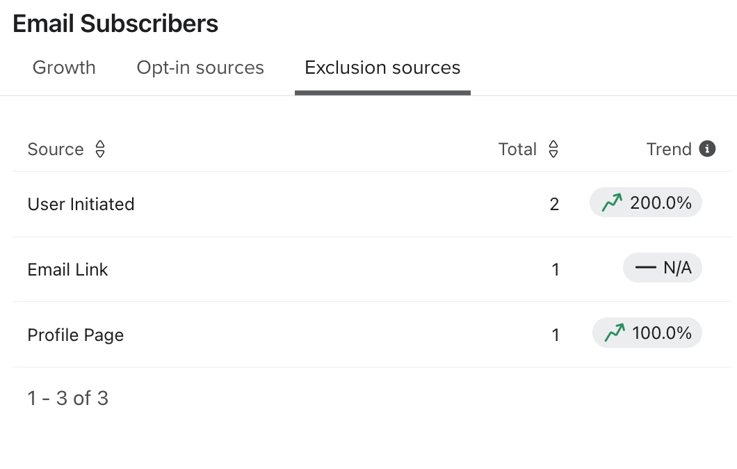 Pamiętaj, że możesz zauważyć rozbieżność między liczbą nowych subskrybentów w zakładce Wzrost a liczbą profili w zakładce Źródła Opt-in. Dzieje się tak dlatego, że jeśli ktoś wycofać subskrypcję w tym samym dniu po subskrypcji, nie będą one brane pod uwagę w nowej liczbie subskrybentów.