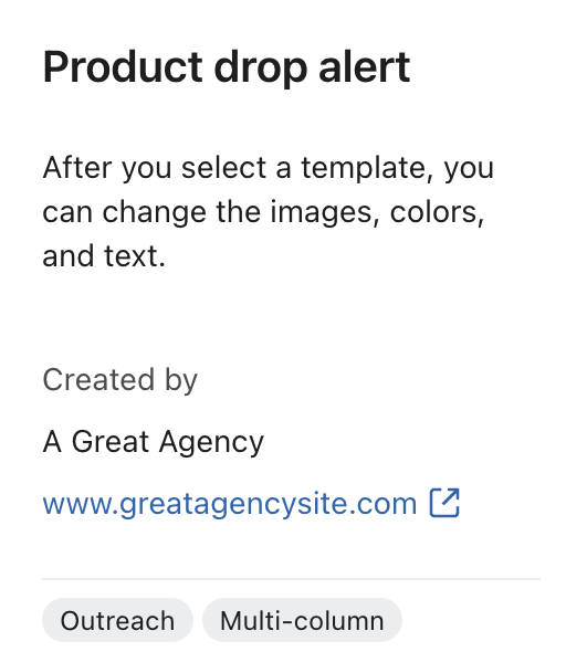 Możesz zobaczyć nazwę agencji i stronę internetową każdego twórcy szablonu partnerw oknie podglądu selektora szablonów. Wejdź na ich stronę internetową, aby skontaktować się z nimi i dowiedzieć się więcej o ich ofercie.