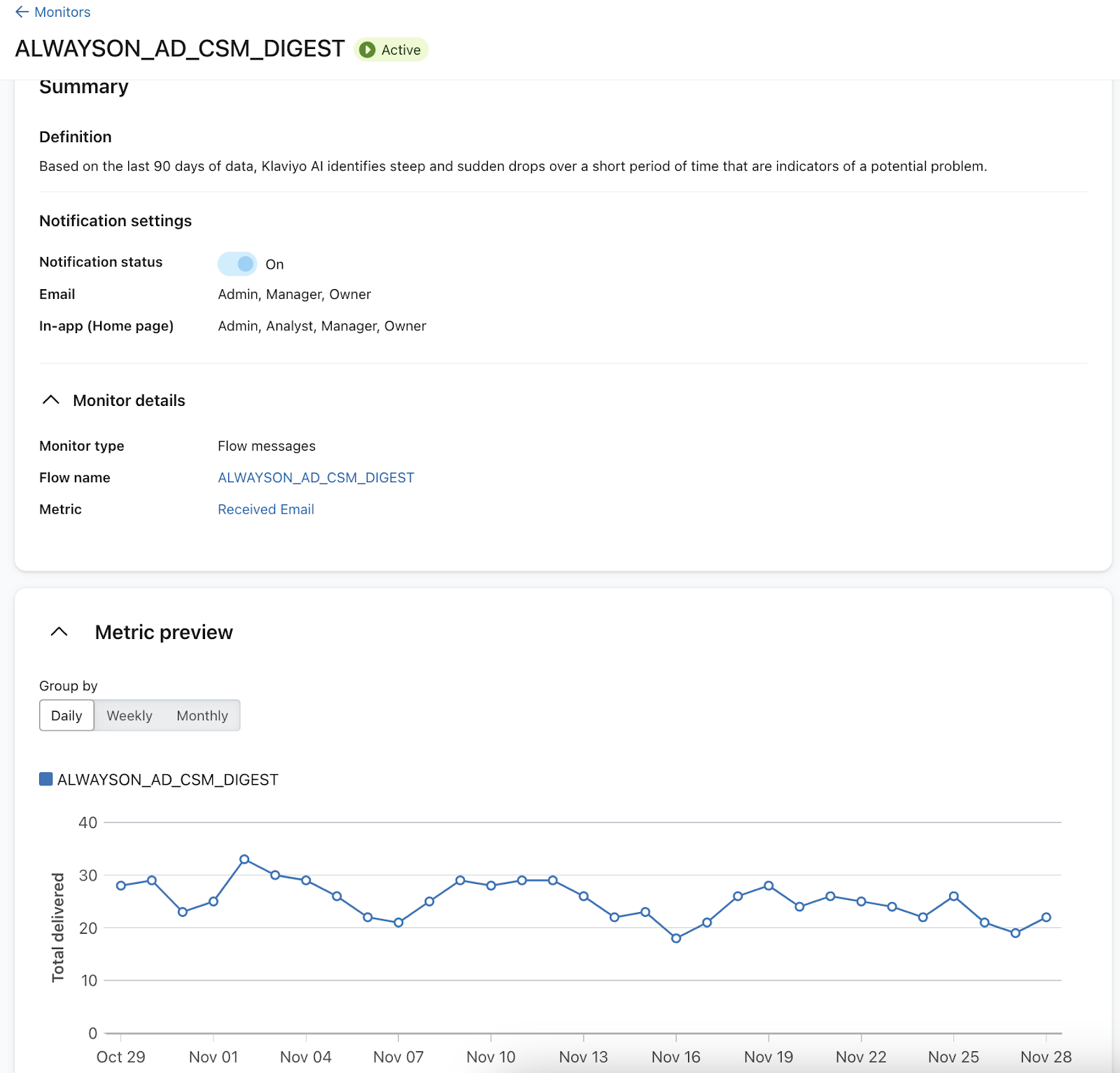 Jeśli jesteś zaawansowaną platformą danych klientów Klaviyo, możesz wyświetlać zarówno monitorowanie niestandardowe, jak i automatyczne na tej samej stronie.