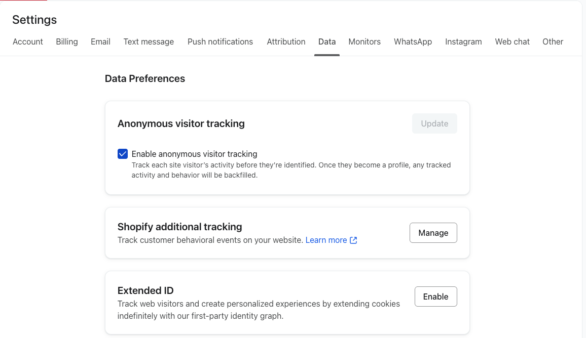 Wyłączając jeden lub wszystkie rozszerzone identyfikatory ID, natychmiast przywrócisz Klaviyo domyślne ustawienia śledzenia.