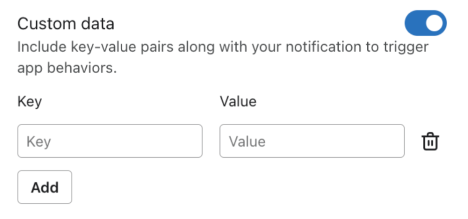Możesz je znaleźć w zakładce Zachowania podczas tworzenia powiadomienia push. Aby z nich skorzystać, przełącz na Dane niestandardowe, a następnie dodaj klucze i wartości. Możesz dodać do 10 par klucz-wartość na powiadomienie push.