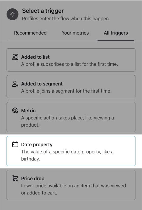 Dowiedz się , jak utworzyć sekwencję wyzwalaną przez właściwość daty w Klaviyo.