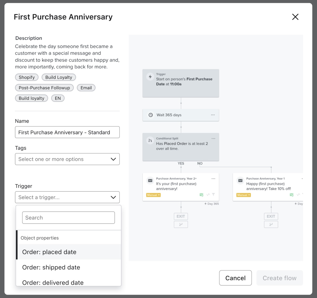 - Wybierz wbudowaną, wstępnie zbudowaną sekwencję, która używa wyzwalacza daty. Na przykład, możesz wybrać sekwencję taką jak Pierwsza Rocznica Zakupu.