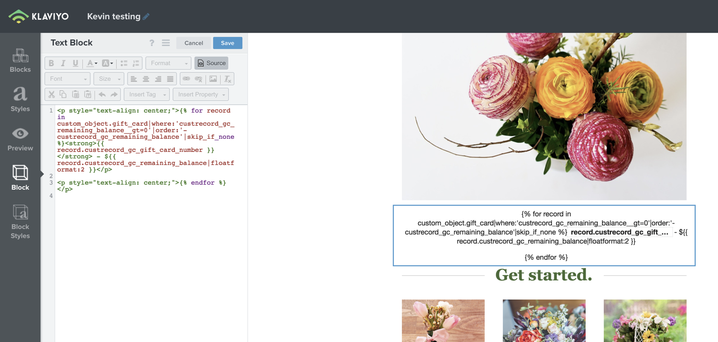Dowolne pole w obiekcie niestandardowym może zostać przeciągnięte do treści wiadomości e-mail. Na przykład możesz użyć znacznika szablonu, aby wstawić zmienną, która pokazuje kod karty podarunkowej, aktualną wartość karty podarunkowej i datę wygaśnięcia.