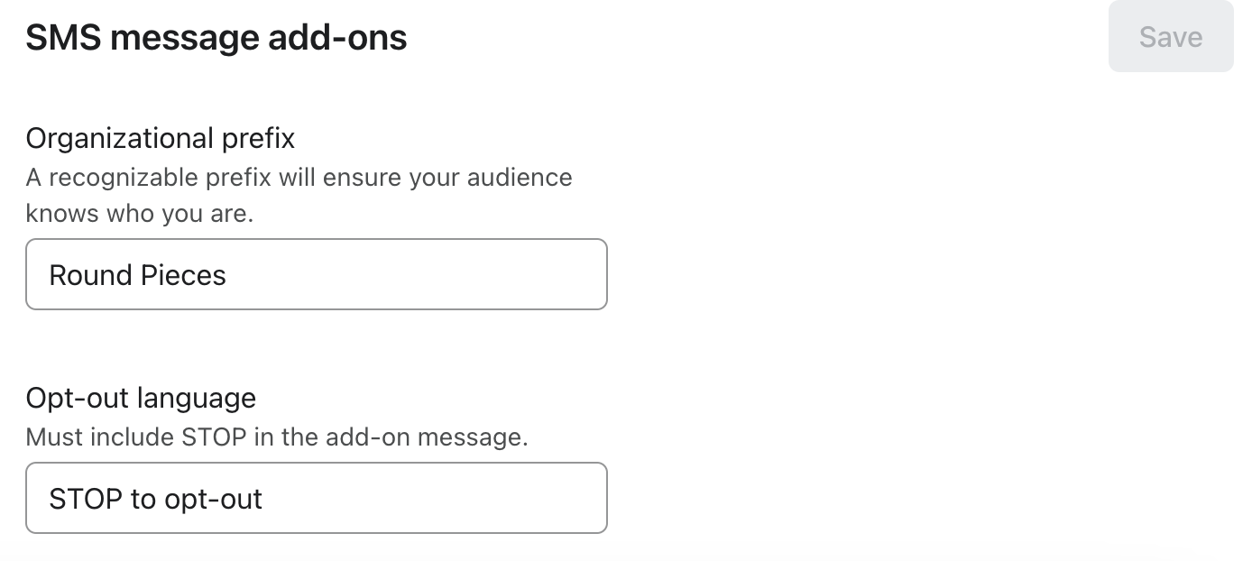 - Prefiks organizacji Prefiks organizacyjny to nazwa Twojej firmy. Powinno to być słowo lub fraza, którą klient rozpoznaje jako tytuł Twojej firmy. Przedrostki są opcjonalne (z wyjątkiem Francji, gdzie są wymagane). Prefiksy te są jednak wysoce zalecane, ponieważ w przeciwieństwie do wiadomości e-mail, wiadomości tekstowe nie mają wbudowanego sposobu identyfikacji nadawcy. Prefiks ten pozwala klientowi zrozumieć, że tekst pochodzi bezpośrednio z Twojego sklepu.