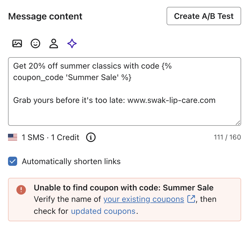 Po wygenerowaniu lub przesłaniu kuponu na stronę Klaviyo, możesz zacząć dołączać kupon do SMS lub MMS kampanie wysyłane do Twojego subskrybenta. Do jednej wiadomości SMS można dodać tylko 1 kod kuponu.