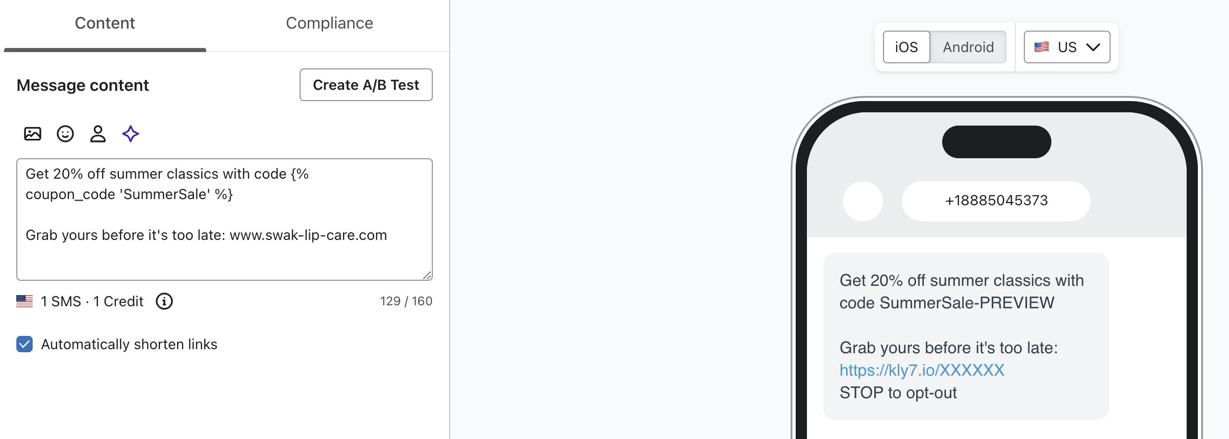 - Uwzględnij co najmniej 5 dodatkowych znaków w swoim SMS lub MMS, gdy dołączasz kupon dynamiczny.