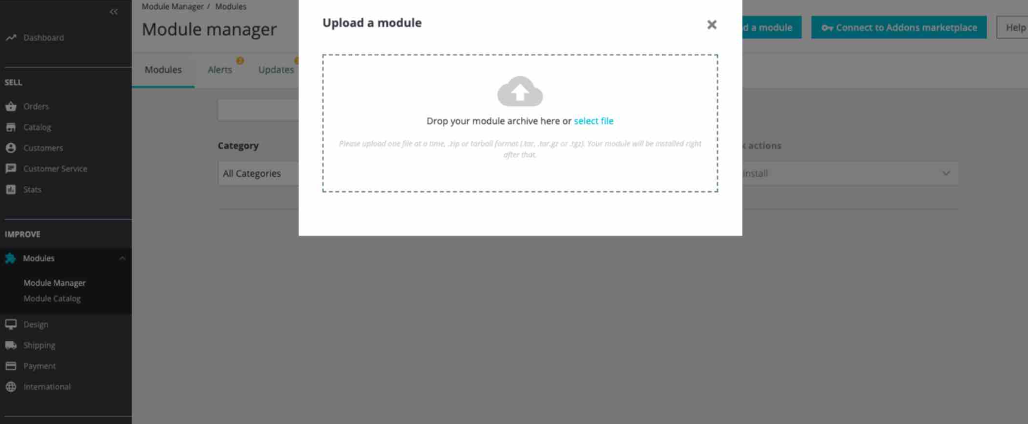 - Zaloguj się do sklepu PrestaShop i przejdź do Moduły > Menedżer modułów. Kliknij Prześlij moduł, a następnie przeciągnij plik ZIP do Menedżera modułów i go tam upuść.