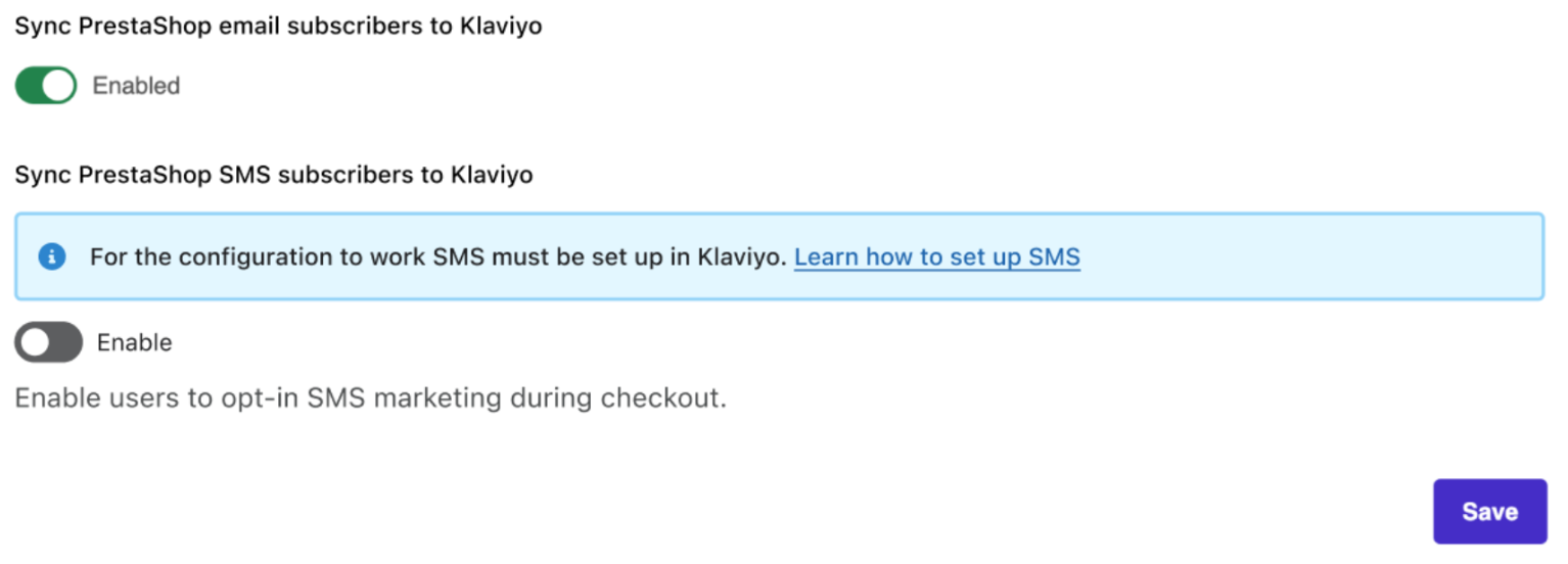 - Jeżeli chcesz synchronizować subskrybentów e-maili pozyskanych na stronie płatności lub za pomocą formularzy rejestracyjnych, włącz opcję Synchronizuj subskrybentów e-maili PrestaShop z Klaviyo.
