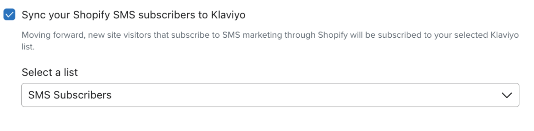 - W zakładce Z Shopify zaznacz pole Synchronizuj subskrybentów Shopify SMS z Klaviyo.