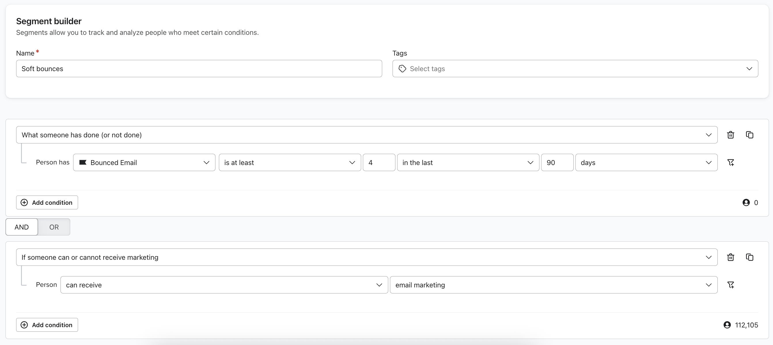 Aby znaleźć te profile, utwórz stronę segment, która identyfikuje przewlekłe odbicie miękkie. Budując swoją stronę segment, uwzględnij wszystkie osoby, które w ciągu ostatnich 90 dni odrzuciły co najmniej cztery wiadomości e-mail i które mogą otrzymywać marketingowe wiadomości e-mail. Przykład tego segment jest pokazany poniżej.
