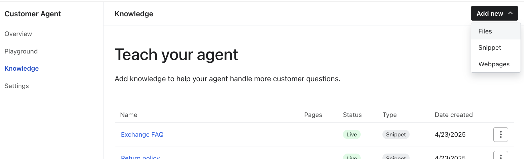 Jeśli zauważą Państwo luki podczas testowania lub chcą proaktywnie reagować na częste zapytania klientów, mogą Państwo poprawić swoją wiedzę Customer Agentpoprzez ręczne dodawanie informacji w zakładce Wiedza.