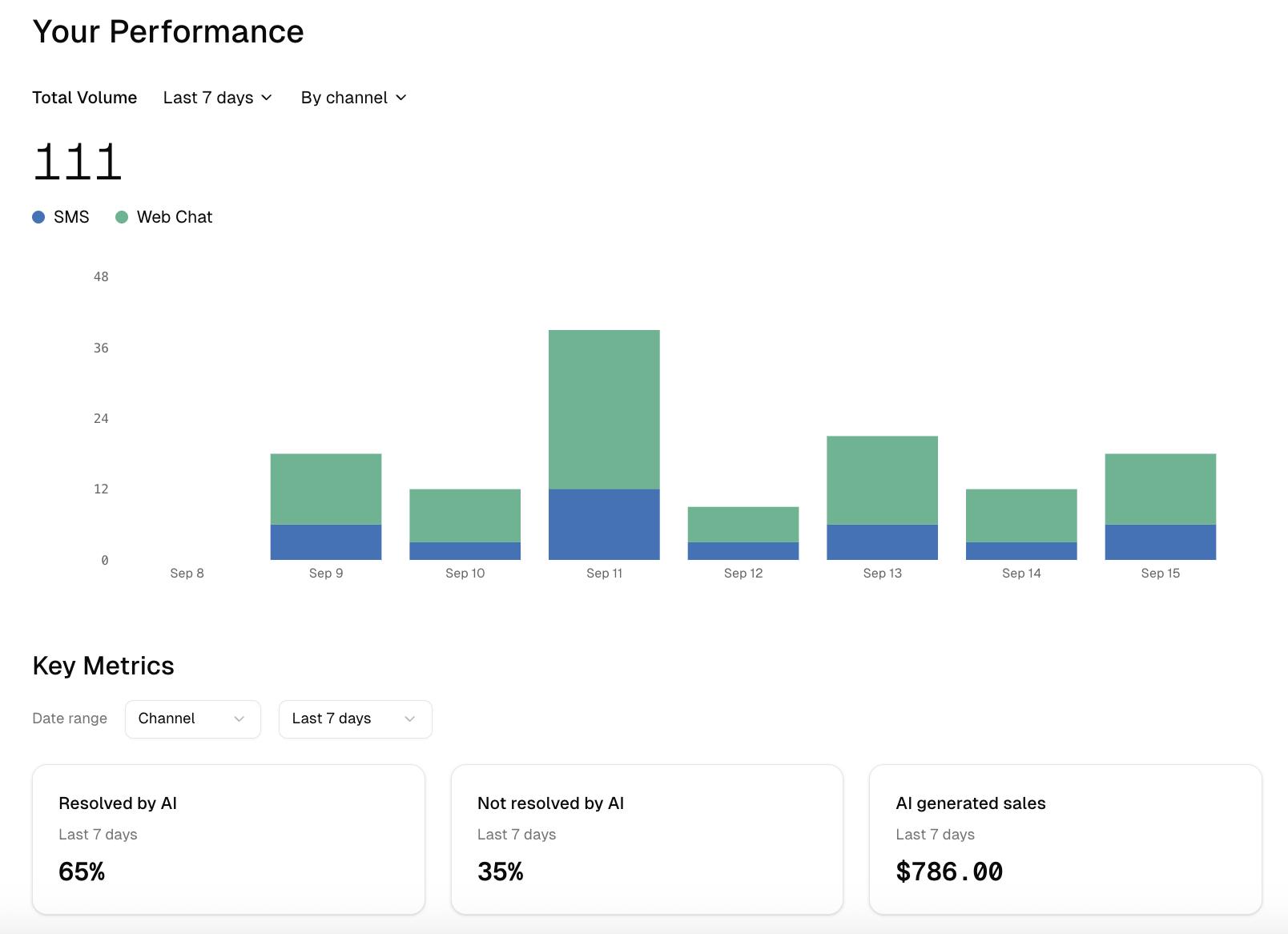Wszystkie rozmowy Customer Agentsą rejestrowane w Państwa pulpicie przeglądowym, wraz z kluczowymi metrykami wydajności, takimi jak Rozmowy rozwiązane przez sztuczną inteligencję i sztuczna inteligencja przypisana przychodom / przychodom. Niski wskaźnik rozwiązywania może wskazywać na luki w wiedzy i obszary, w których Państwa Customer Agent może potrzebować dodatkowego szkolenia.
