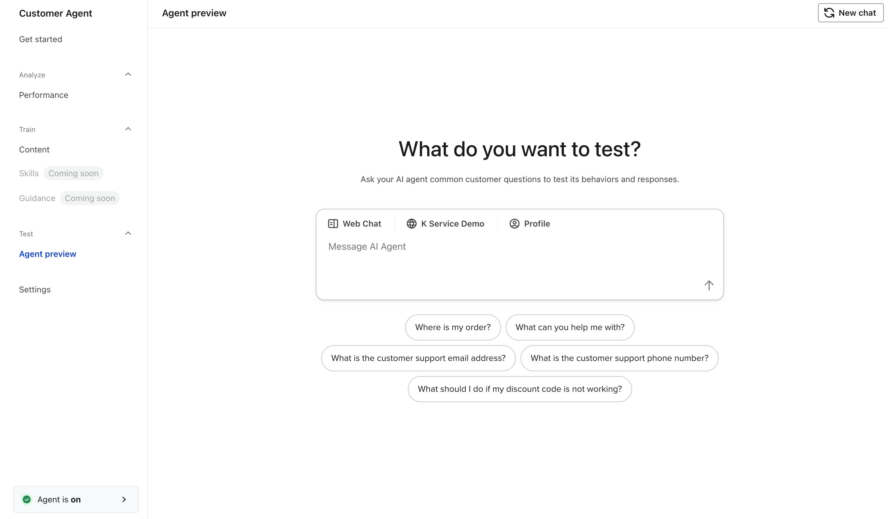 Customer Agent uczy się poprzez skrobanie stron Państwa witryny, ale może nie być w stanie od razu odpowiedzieć na każdy rodzaj pytania. Aby upewnić się, że strona Customer Agent zapewnia dokładne i pomocne odpowiedzi, ważne jest, aby przetestować ją, zadając różne pytania dotyczące witryny w środowisku podglądu (zakładka Plac zabaw na stronie Klaviyo). Przed uruchomieniem strony Customer Agent należy przeprowadzić intensywne testy, które należy kontynuować po jej uruchomieniu.