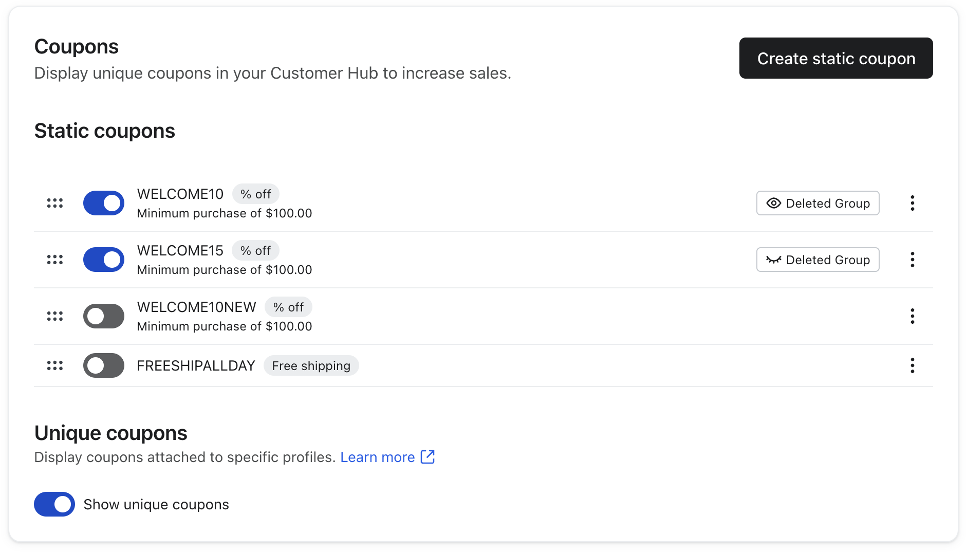Kupony dynamiczne są domyślnie włączone w Klaviyo Customer Hub; nie musisz nic konfigurować.