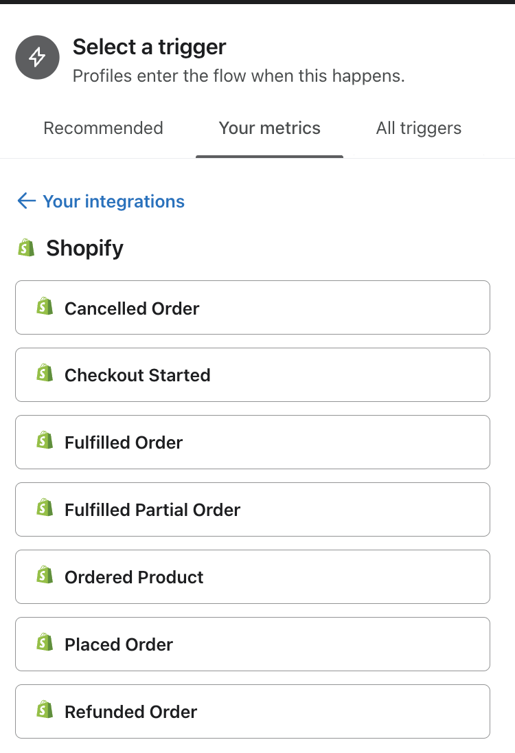 - W przypadku wyzwalacza sekwencji wybierz opcję Zrealizowane zamówienie częściowe z metryki Shopify w obszarze Twoja metryka.