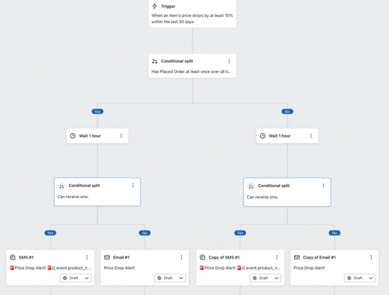 Poniższy przykład pokazuje, jak to wygląda w przypadku sekwencji spadku cen zarówno z SMS, jak i wiadomościami e-mail.