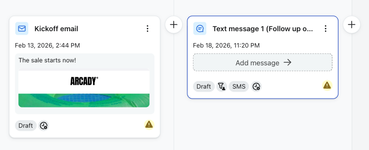 Wiadomości follow-up pozwalają na ponowne zaangażowanie odbiorców w oparciu o to, jak zareagowali na poprzednią wiadomość w Twojej kampanii omnikanałowej, bez konieczności ręcznego tworzenia filtrów odbiorców. Na przykład możesz wysłać wiadomość e-mail do wszystkich odbiorców, a następnie utworzyć wiadomość SMS, która będzie skierowana tylko do osób, które jej nie otworzyły. Klaviyo Automatycznie ustawia odpowiednie filtry odbiorców, dzięki czemu możesz tworzyć wieloetapowe strategie wysyłania do różnych kanałów za pomocą zaledwie kilku kliknięć.