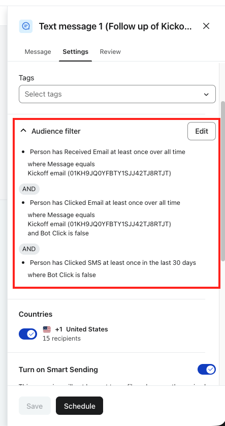 Wskazówka: Funkcje uzupełniające to narzędzie szybkiego startu. Po utworzeniu wiadomości masz pełny dostęp do edycji filtrów odbiorców - dostosuj okno zaangażowania, dodaj warunki lub całkowicie wymień filtry. Przejdź do sekcji Filtry odbiorców w wiadomości uzupełniającej, aby wprowadzić zmiany.