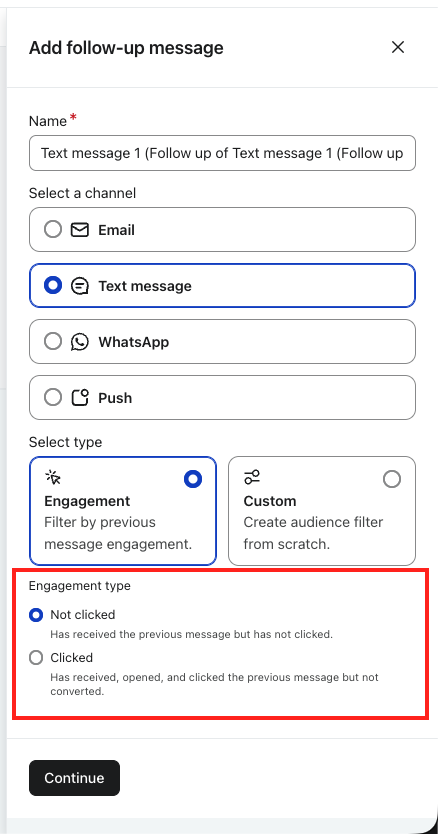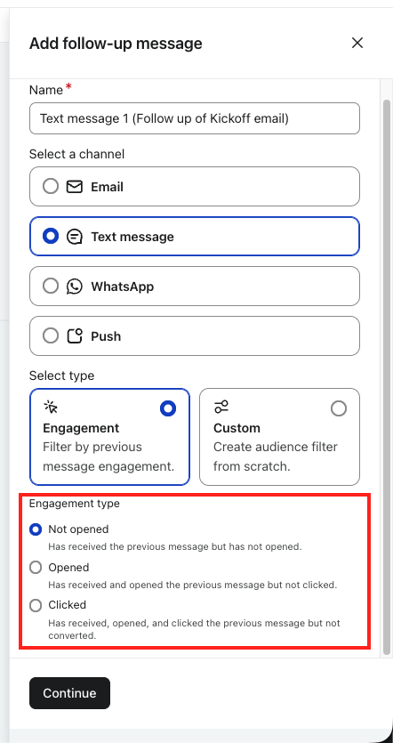 Opcje zaangażowania automatycznie tworzą filtry odbiorców w oparciu o sposób interakcji odbiorców z wiadomością źródłową. Opcje, które zobaczysz, zależą od tego, jakiego kanału używa wiadomość źródłowa.