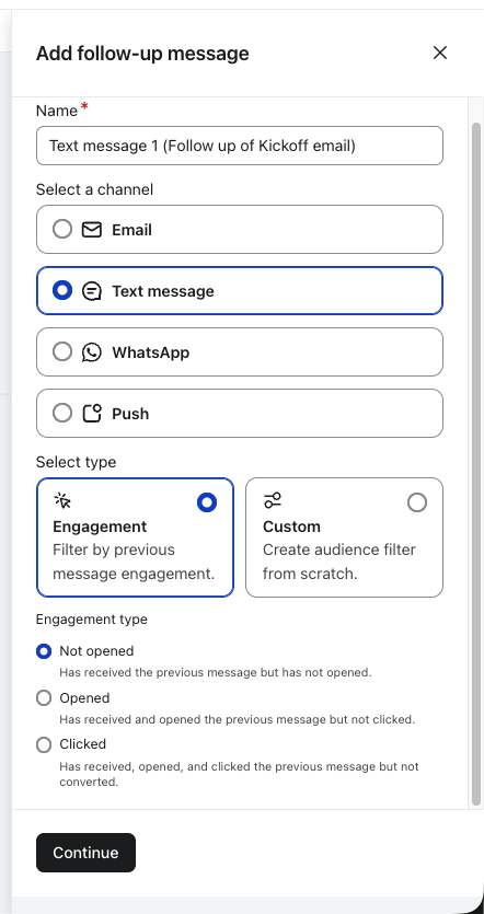 Znasz już e-maile follow-up w kampaniach jednokanałowych? Działania następcze w kampanii omnikanałowej rozszerzają te funkcje - możesz tworzyć działania następcze w dowolnym kanale (nie tylko e-mail), kierować je na podstawie szerszego zakresu warunków zaangażowania i używać niestandardowych filtrów odbiorców w celu bardziej zaawansowanego kierowania.