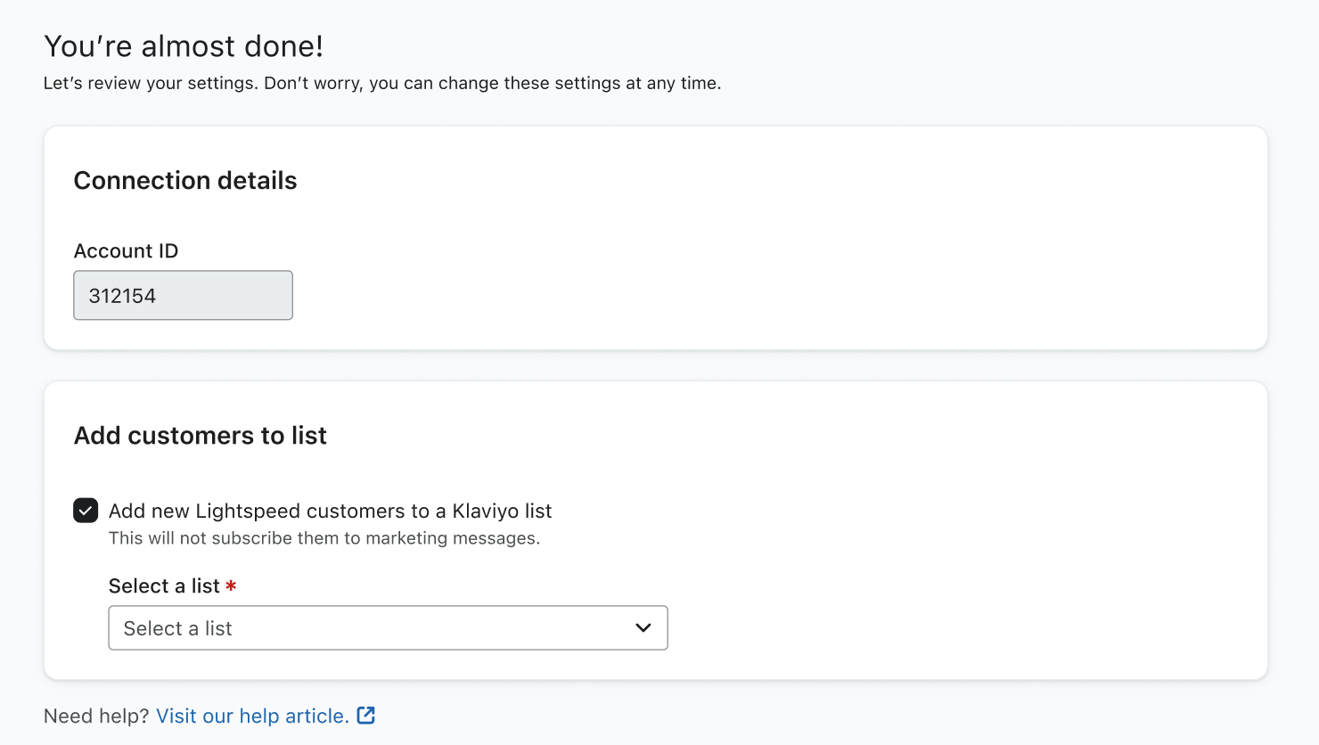 - Escolha se o senhor deseja ou não adicionar novos clientes do Lightspeed a uma lista do Klaviyo e, em seguida, selecione uma lista no menu suspenso.