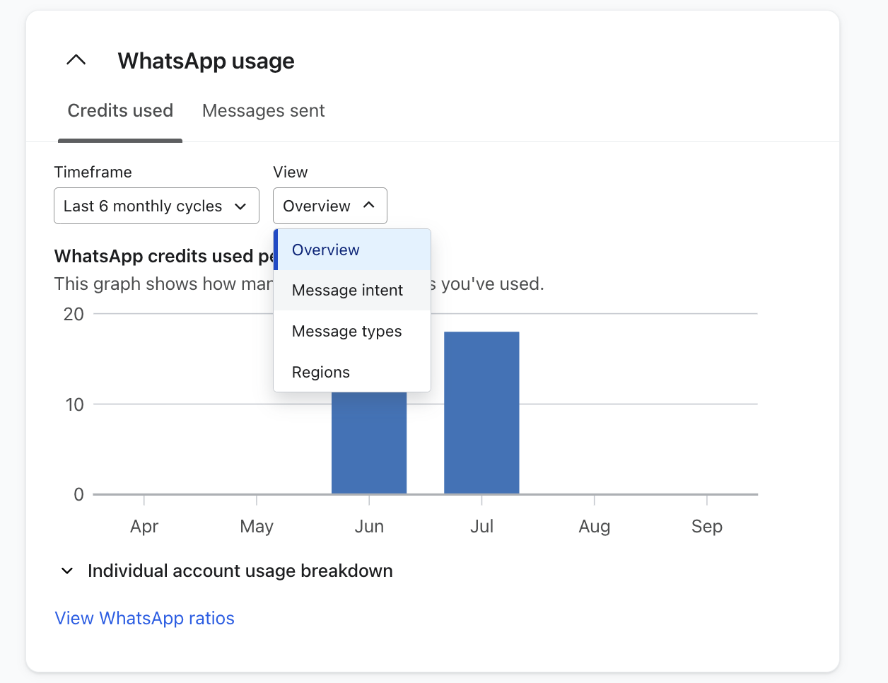 O uso de mensagens do WhatsApp mostra quantas mensagens você enviou (mas não mostra quantos créditos você usou). Ele mostra: