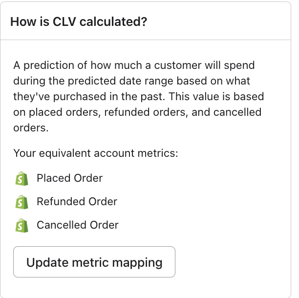 - Na parte superior desse cartão de configurações, o senhor pode ver como seu valor de tempo de vida dos clientes está sendo calculado no momento (ou seja, Pedidos feitos, Pedidos reembolsados e Pedidos cancelados métrica). Se o senhor não tiver dados suficientes para qualquer uma dessas 3 métricas, não verá essa(s) métrica(s) específica(s) aparecer.