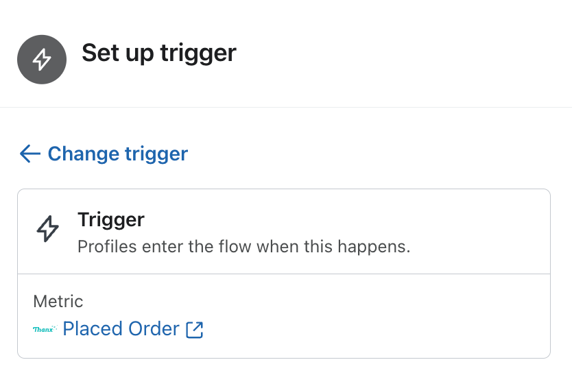 O senhor pode usar a métrica Thanx Placed Order para acionar o fluxo. Por exemplo, o senhor pode enviar mensagens para alguém imediatamente quando essa pessoa se inscrever no seu problema de fidelidade.