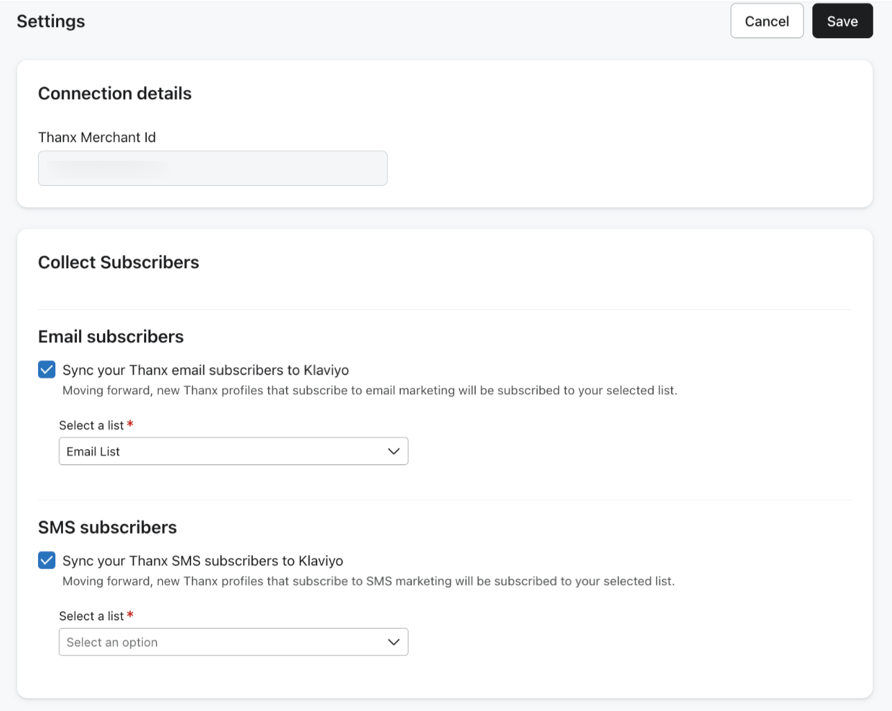 - Marque a caixa para sincronizar Thanx SMS assinante para Klaviyo e selecione uma lista no menu suspenso. Recomendamos manter listas separadas para e-mail e SMS assinante.
