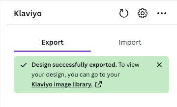 - Quando estiver pronto para exportar, selecione Exportar. Quando a exportação da imagem for concluída, o senhor verá uma mensagem de sucesso com um link para a biblioteca de imagens do Klaviyo.