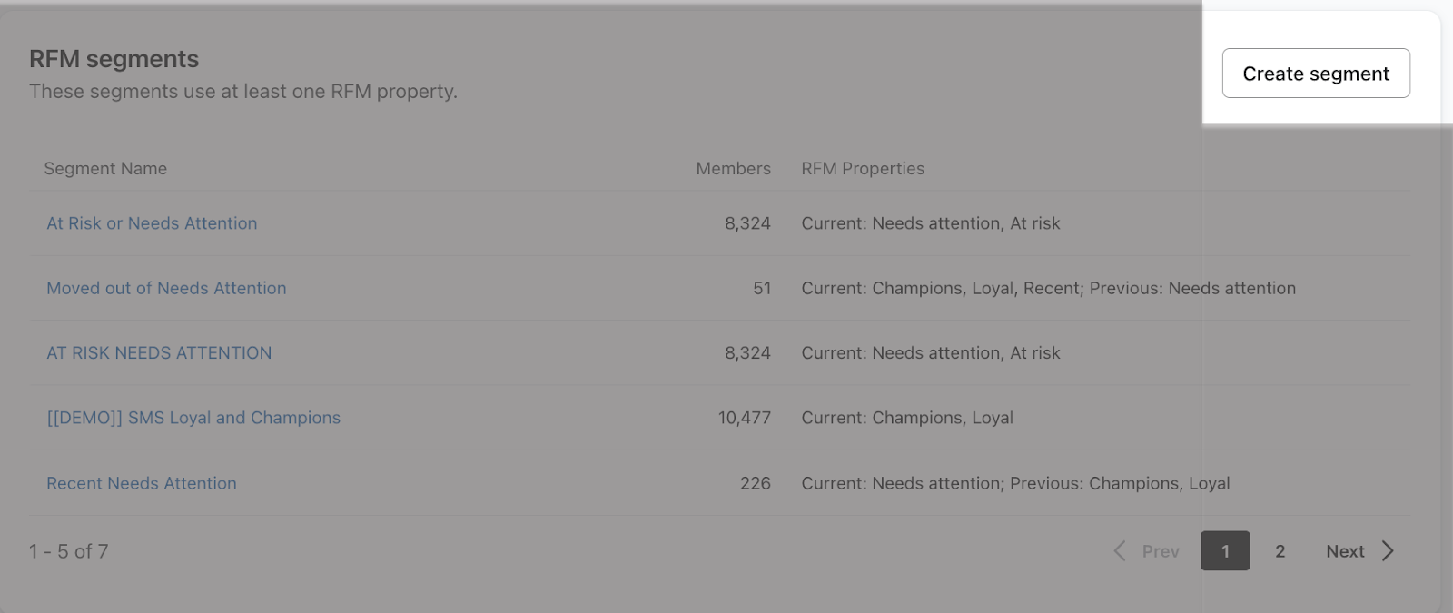 - Role a tela até encontrar o cartão RFM segmento e clique em Create segmento.