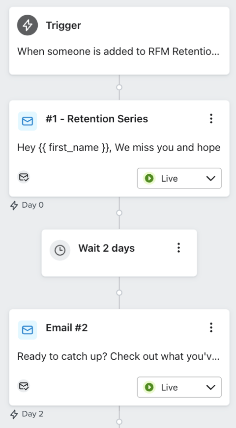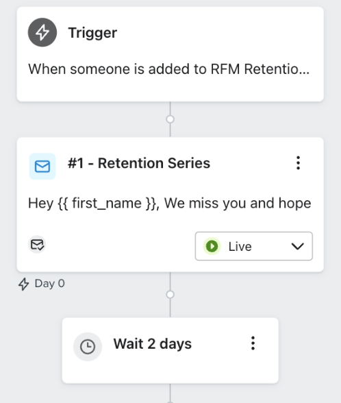 Saiba como criar um fluxo de retenção com base nas propriedades de RFM para atingir clientes que não compraram recentemente. Os fluxos de retenção são fatores úteis para ajudar a reconquistar clientes, alcançando-os no momento certo com a mensagem certa. O senhor pode alcançar automaticamente esses assinantes no momento em que o grupo de clientes deles muda, diminuindo potencialmente a receita e os riscos de rotatividade.