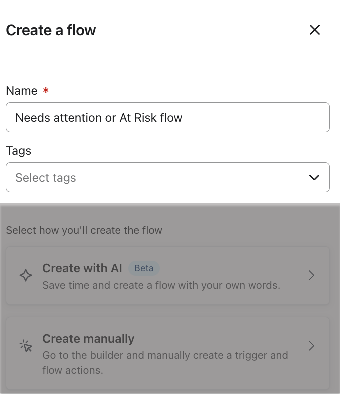 - No painel lateral Create fluxo (Criar fluxo), dê ao seu fluxo um nome reconhecível e selecione qualquer etiqueta que o senhor queira que ele tenha. Por exemplo, algo como "At Risk or Needs Attention fluxo".